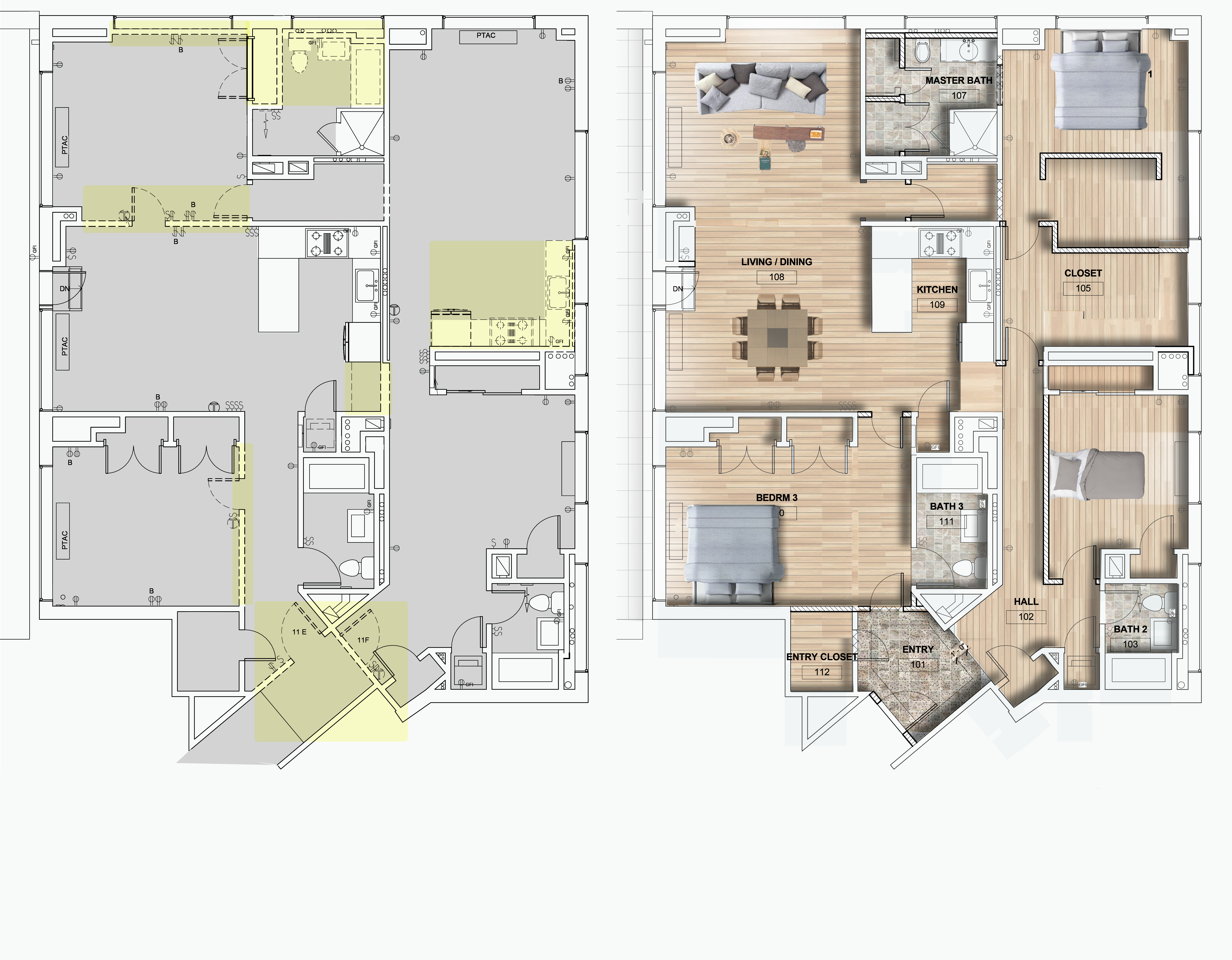 Type This project combined a standard two-bedroom unit and adjacent studio into a three bedroom with a gracious master bedroom suite. The new plan places the enlarged dining and living along the west side to take in expansive views of Central Park. The living and dining area was enlarged to accommodate easy-living for a growing family and an office was added to enhance the usability of the apartment.