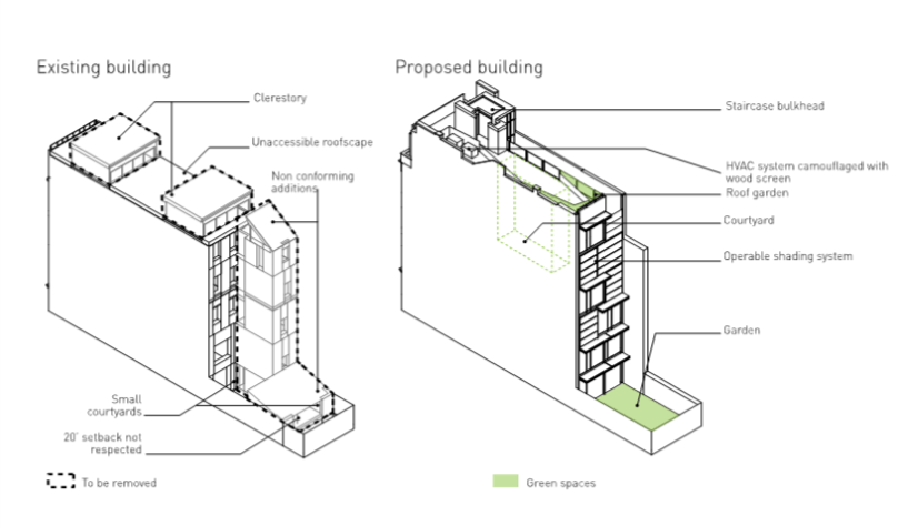 The design features a light well through the center of the upper dwelling unit to bring natural light into the center of the building and create internal views. A xeriscape landscape plan for the roof deck is incorporated into design along and includes rainwater retention and storage. The new construction is planned to meet all current NYC codes for energy conservation and life safety.