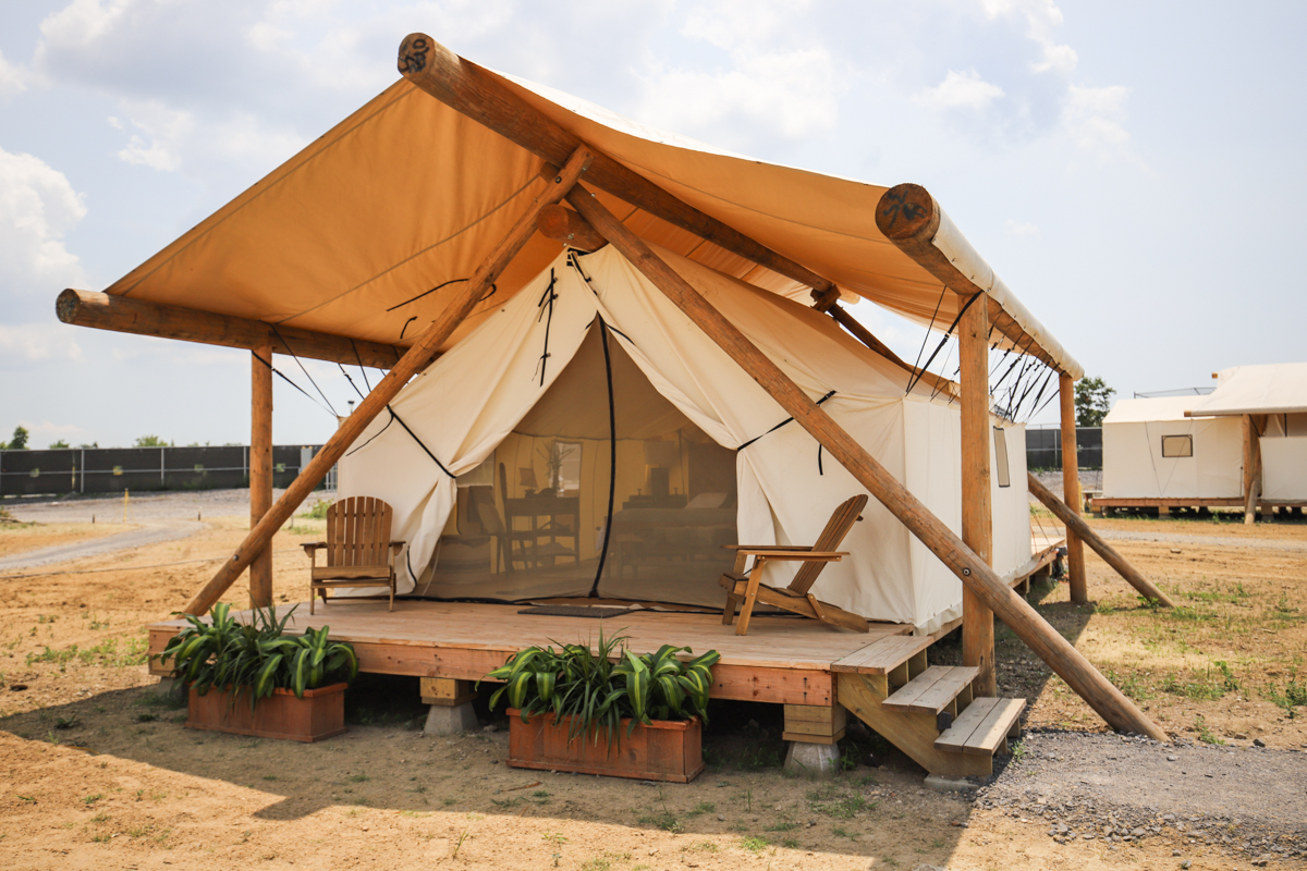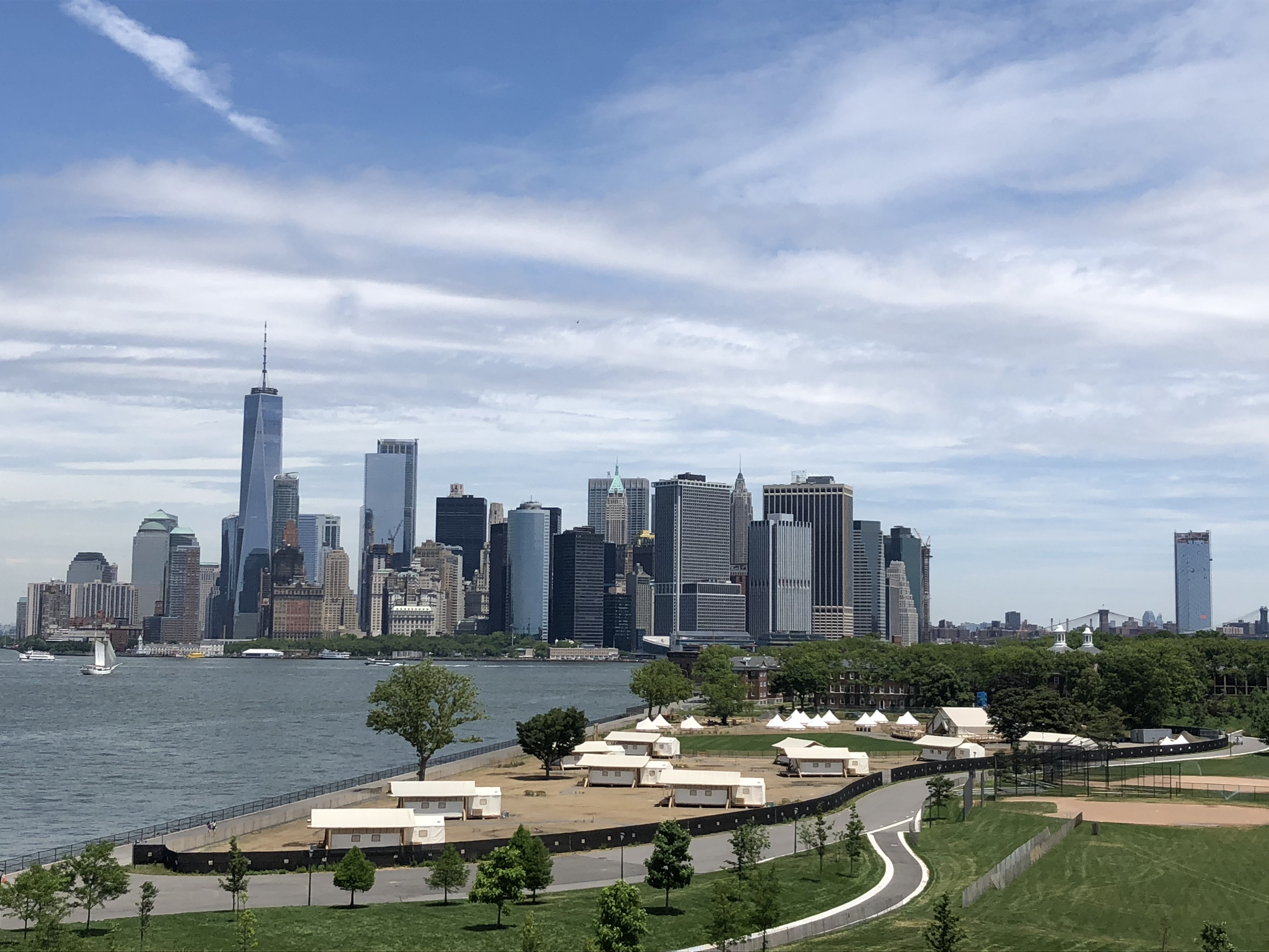 The six acre site houses luxury tents and accommodations for up to 100 guests. These tents are carefully sited to preserve views of the water and Statue of Liberty while preserving privacy between units. The main lodge features an expansive curving deck that overlooks the great lawn and the Manhattan Skyline.